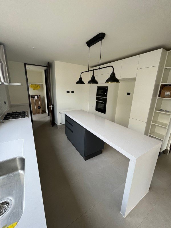 Amplia cocina con gran isla central para comedor de diario, horno y microondas empotrados junto a encimera con cocina eléctrica, y espacio para refrigerador de 2 puertas