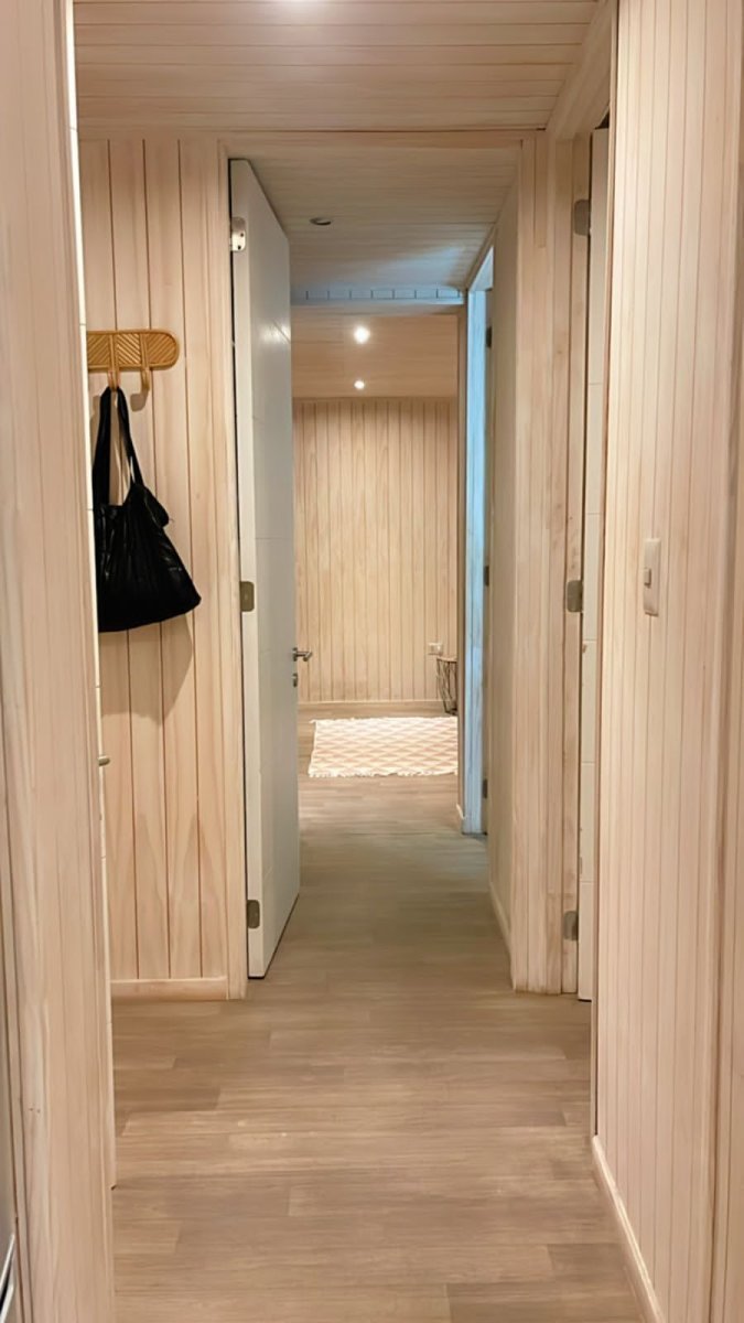 Distribución: living y comedor, cocina equipada con horno, encimera y campana, logia y terraza. Dos habitaciones y dos baños (la principal con baño en suite).