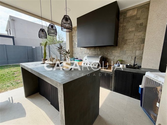 Terraza techada, quincho en obra con mesón isla empotrado, ventiladores. Jardín formado y piscina. Estacionamientos para 2 autos.