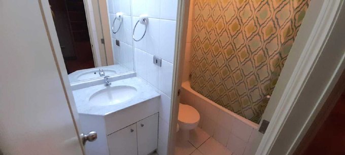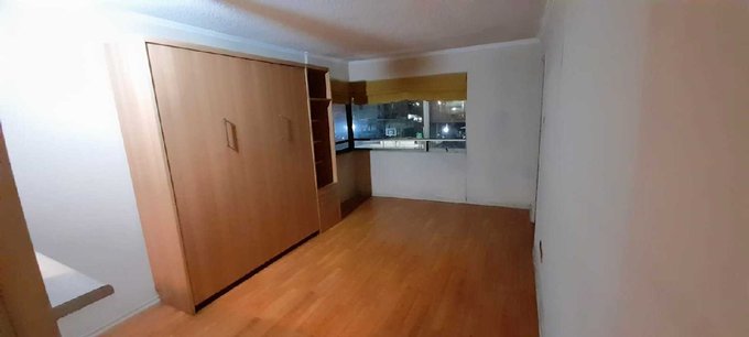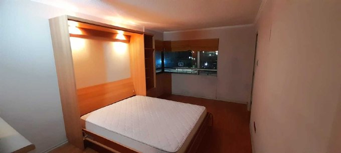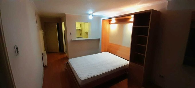 Amoblado con: Encimera, horno, muebles de cocina, cama mural Wallbed de 2 plazas con librero y velador incorporado, frigo bar, utensilios de cocina (servicios, ollas, otros), cortinas,en ventanas y de ducha.