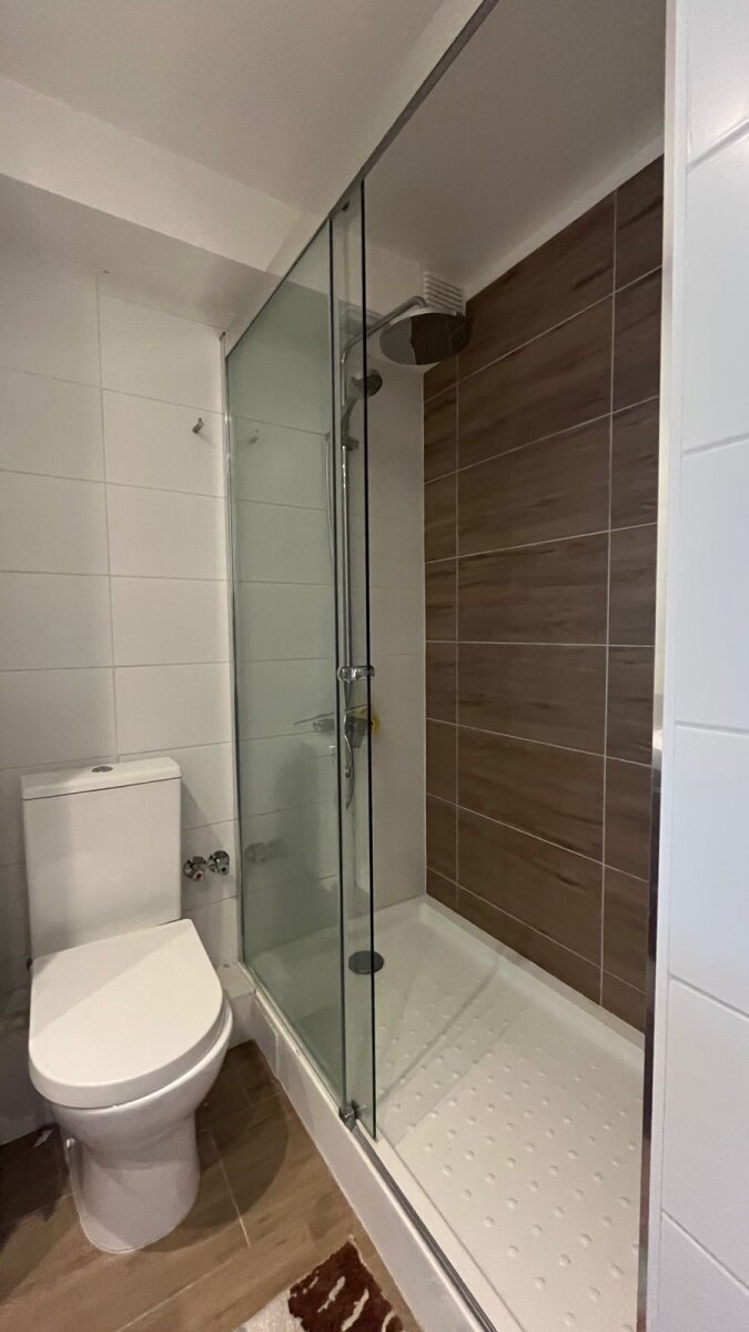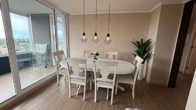 Living y comedor, amplia terraza cerrada con cortinas de cristal y con vista panorámica al norte, cocina equipada con encimera vitrocerámica, horno eléctrico y campana. Incluye dos estacionamientos subterráneos y una bodega.