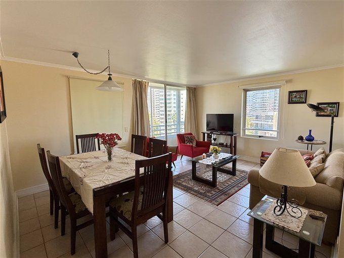 Recibidor. Living y comedor con salida a terraza (sur-poniente). Cómodo sofá y par de sitiales, mesa de centro, TV, comedor con cubierta de vidrio para 6 personas.
