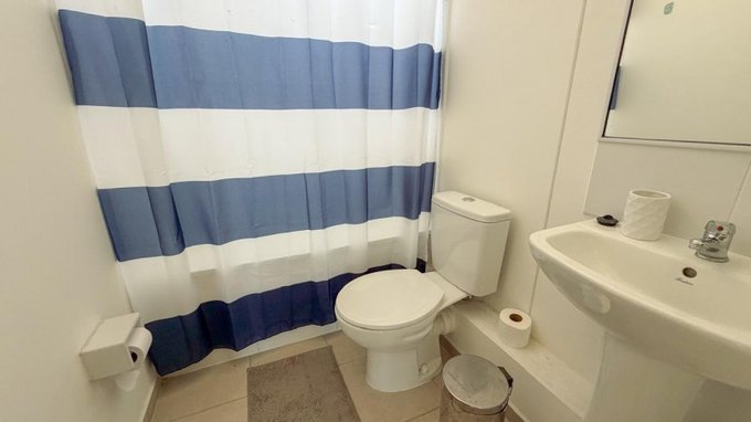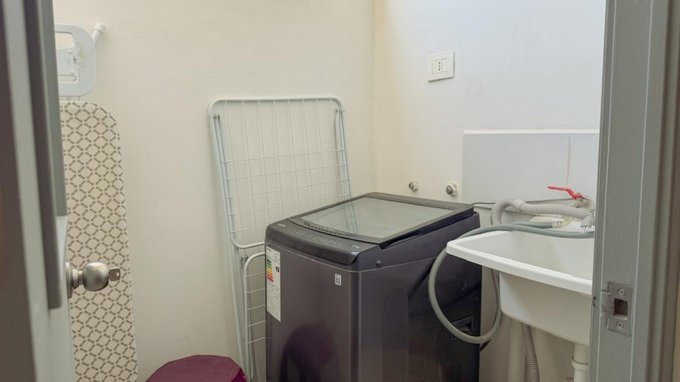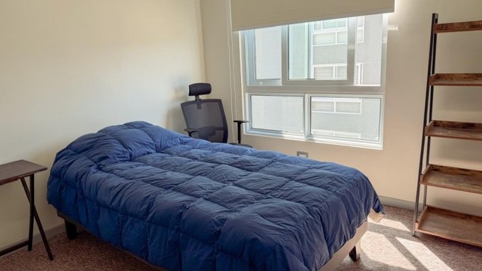 El departamento cuenta con 2 dormitorios, principal en suite, y 2 baños (uno con ventilación natural), además de living comedor con salida a terraza. La cocina es incorporada y está equipada con muebles base y muro, isla central con cubiertas de cuarzo, encimera eléctrica, horno empotrado y campana, además de refrigerador, lavadora, aspiradora y termo para agua caliente. Dispone de logia con lavadero y conexión a lavadora, ventanas PVC termopanel con cortinas roller y pisos mixtos de cerámica, flotante y alfombra.