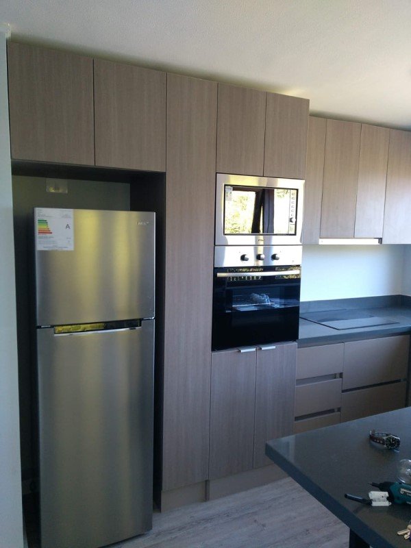 La cocina está completamente equipada con cubiertas de granito, muebles en piso y muro y artefactos eléctricos tales como cocina encimera de vitrocerámica, campana, refrigerador, horno eléctrico empotrado, horno microondas y termo eléctrico.