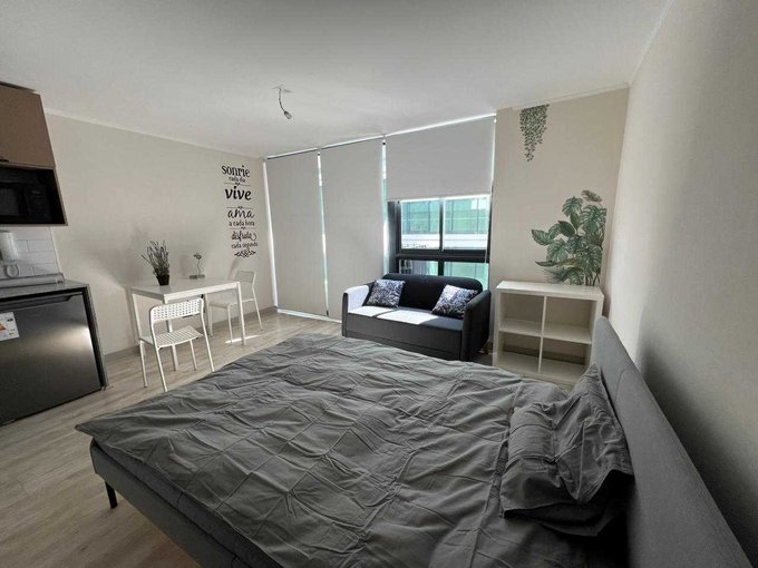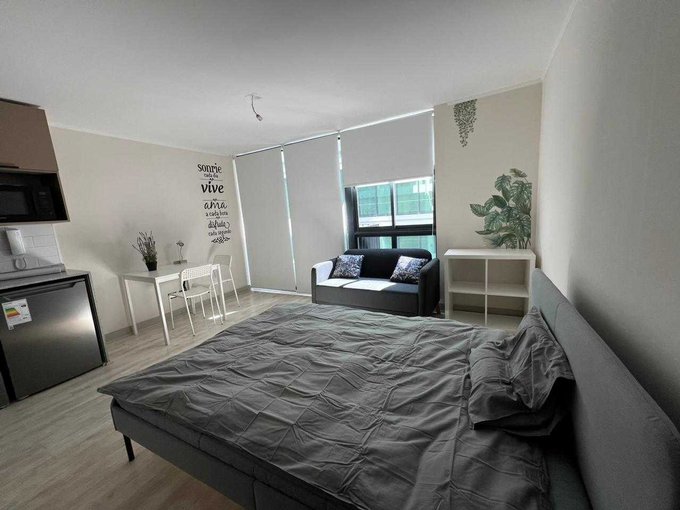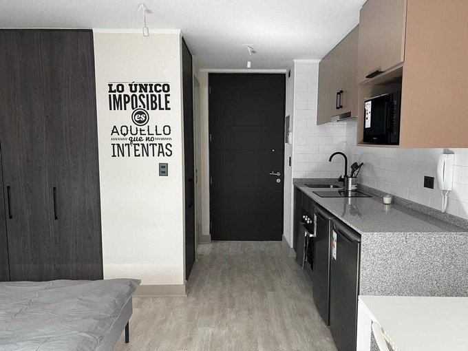 Moderno departamento tipo estudio, baño completo, cocina full equipada, refrigerador y microondas.