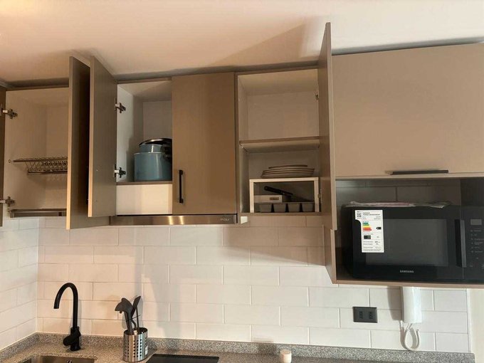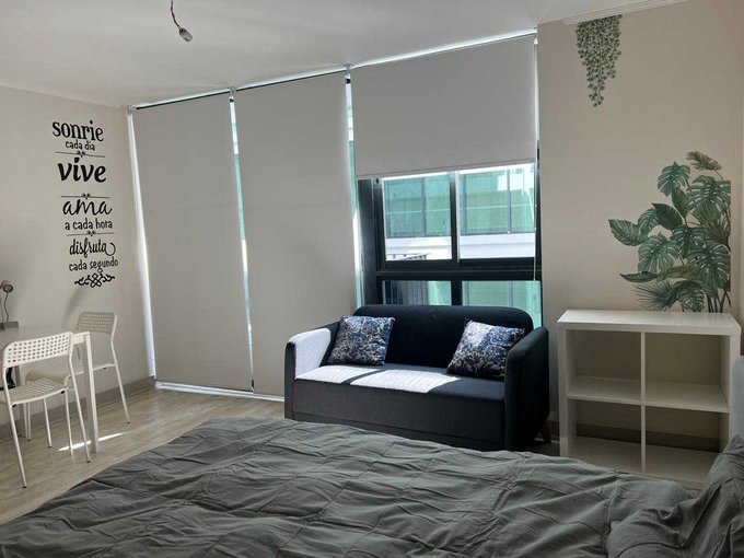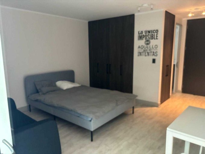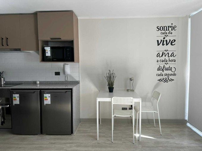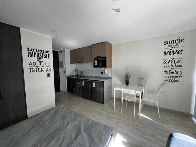 Moderno departamento tipo estudio, baño completo, cocina full equipada, refrigerador y microondas.