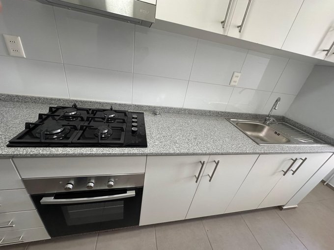 Cocina equipada a gas y muebles recién remodelados
