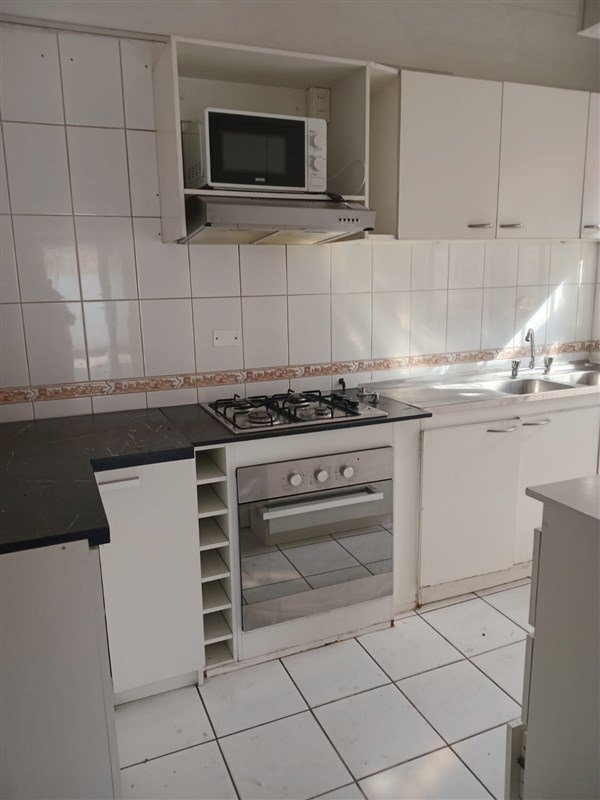 Cocina equipada con cocina a gas de cañería, muebles y extractor