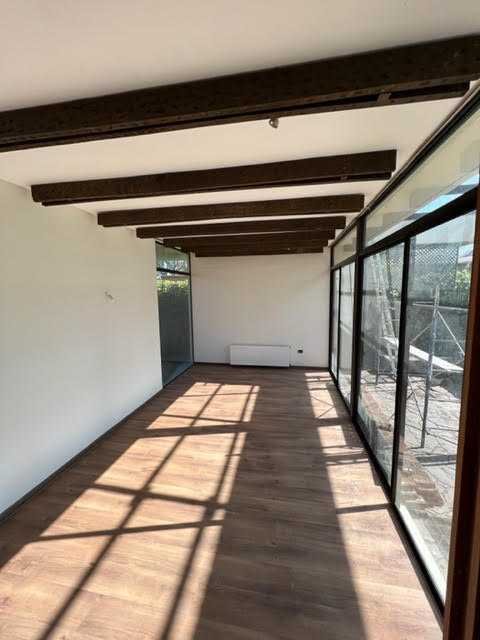 El diseño de la casa contempla áreas comunes con pisos en tonos cálidos y grandes ventanales que permiten vistas hacia el jardín. La cocina está equipada con mobiliario en tonos madera, encimeras extensas y ventana hacia el exterior, aportando funcionalidad al espacio. Los dormitorios cuentan con ventanas amplias y algunas habitaciones disponen de salida directa al jardín, generando continuidad entre los espacios interiores y exteriores.