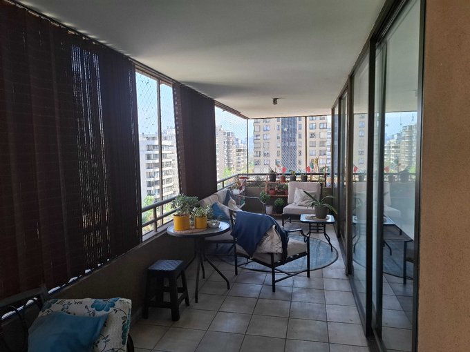 Hall entrada; cocina amplia amoblada, logia grande; pieza y baño de servicio; living-comedor con salida al norte con terraza pequeña y al poniente gran terraza; Hall de distribución con closet del dormitorio pequeño; 3 dormitorios (dos con w. closet); 2 baño completos ciegos (uno en suite)