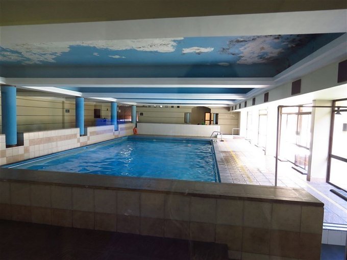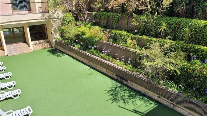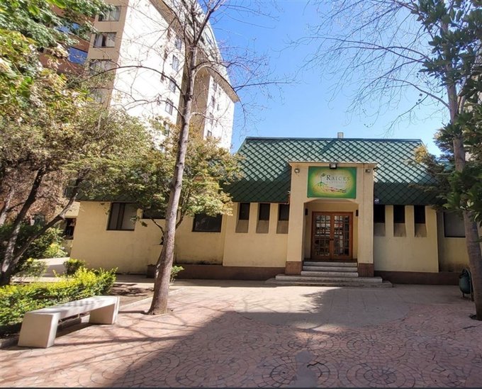 Edificio con parque, piscina temperada, lavandería y salas de eventos.