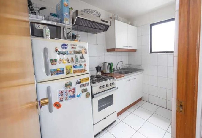 - Refrigerador, cocina a gas, microondas, campana en Cocina.