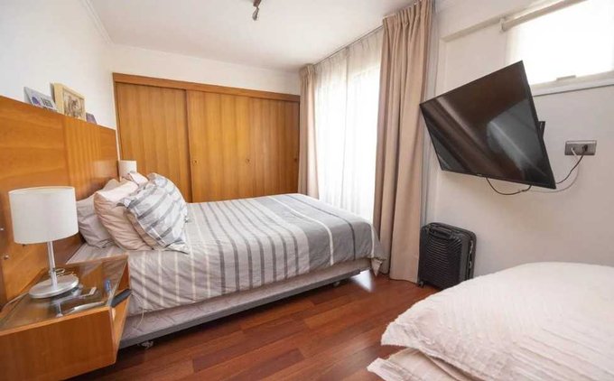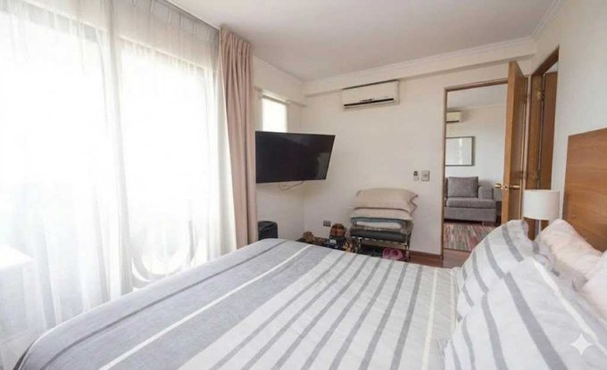 - Cama dos plazas, veladores lámparas, cortinas y tv en dormitorio