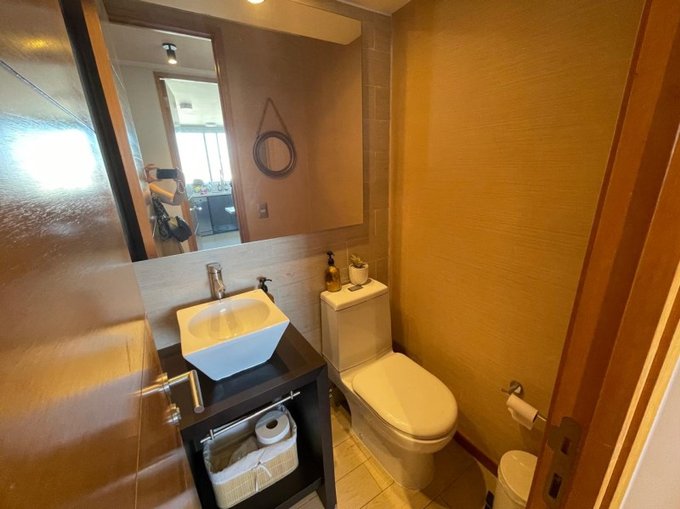 Hacia la mano izquierda nos encontramos con un baño de visita, dormitorio de servicio con espacio para una cama de una plaza con velador y closet y un baño con ducha, de frente una cocina muy amplia cuadrada y muy bien equipada (mesón para desayuno, espacio para un refrigerador de dos puertas, horno microondas y horno empotrados, encimera vitrocerámica y campana extractora (todo eléctrico) y finalmente una cómoda loggia.