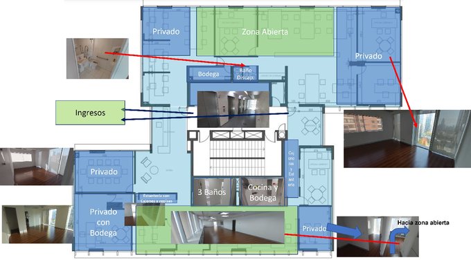 397 m, con zonas abiertas para puestos de trabajo, 5 privados de buen tamaño, Cocina y 4 baños (incluyendo uno para personas con discapacidad)