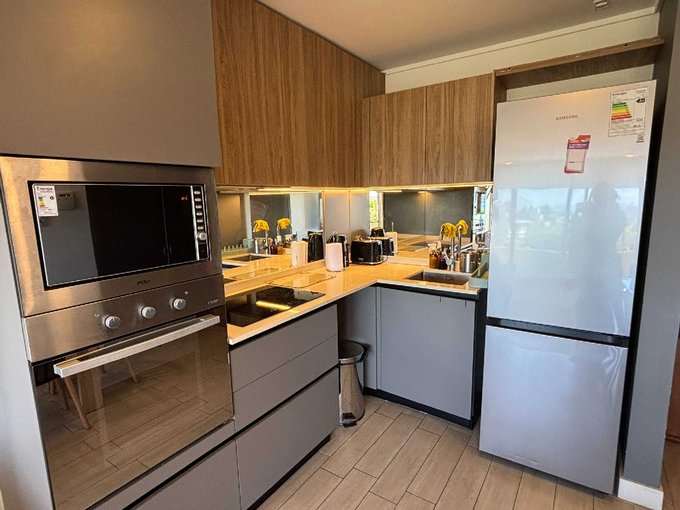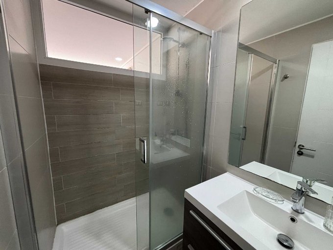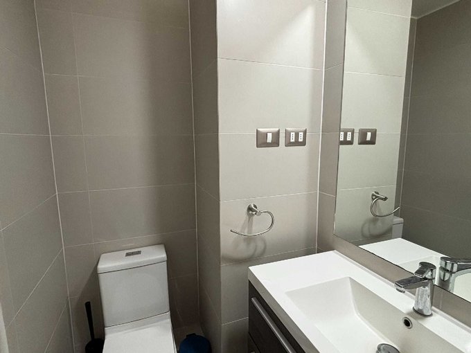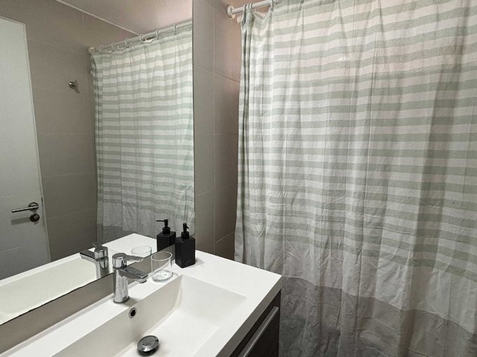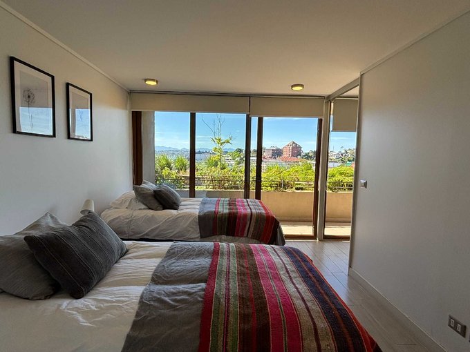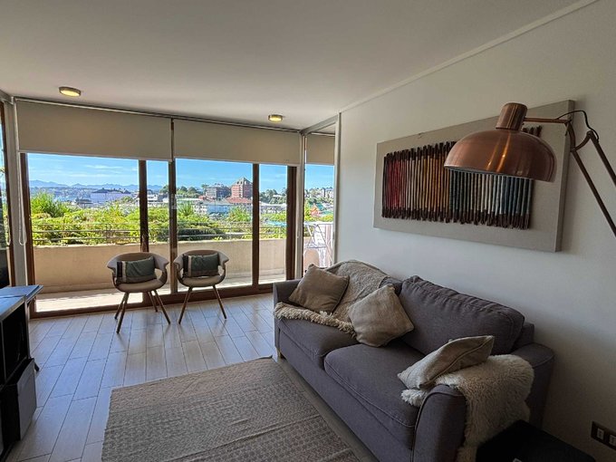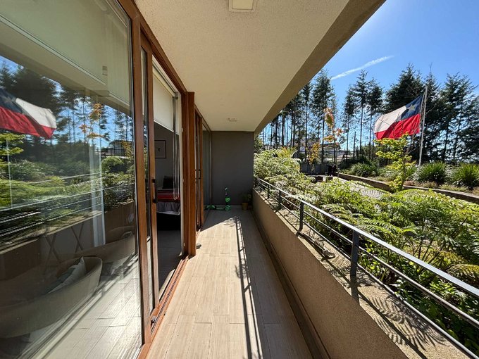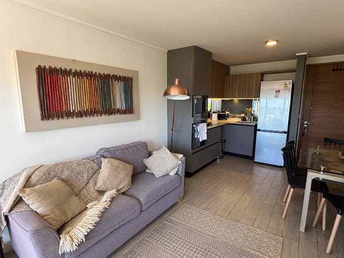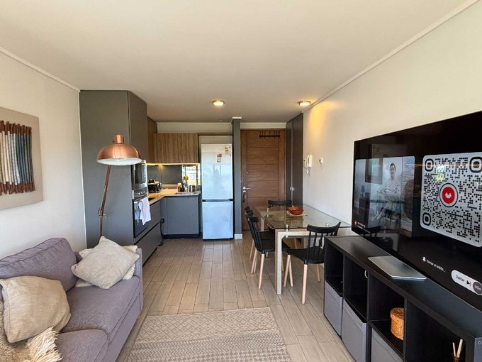 El departamento consta de 68 m2 + 11,95 m2 de terraza y cuenta con 2 dormitorios en suite con clóset, living comedor y cocina americana amoblada y equipada con encimera, horno, campana y microondas.