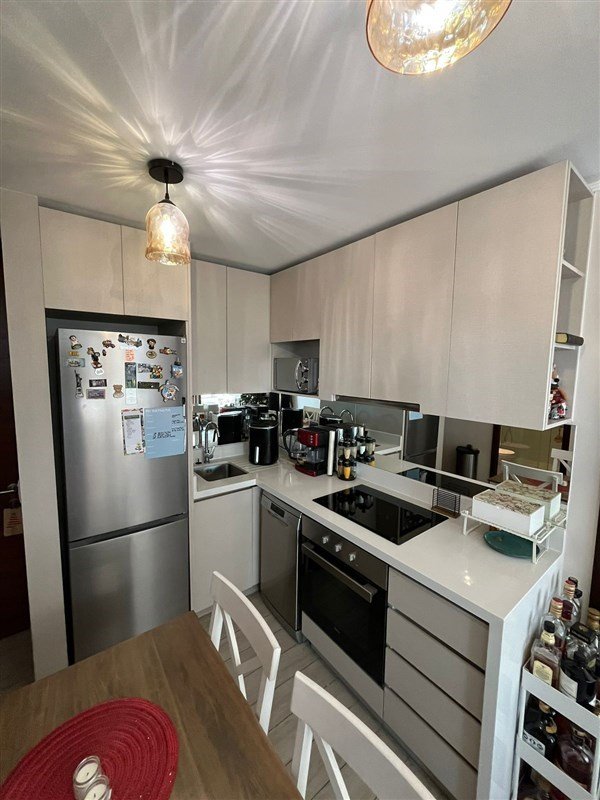 - Cocina con muebles cubierta de cuarzo, equipada con encimera, horno y campana.
