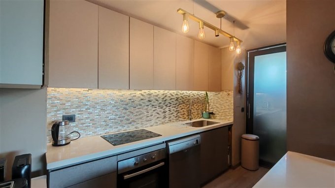 Cocina amoblada y totalmente equipada con horno eléctrico, encimera, microondas y refrigerador