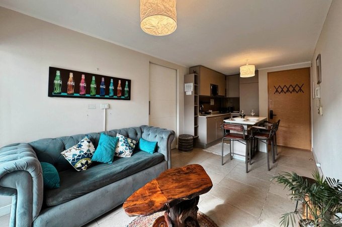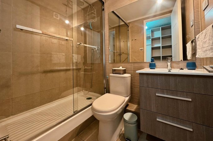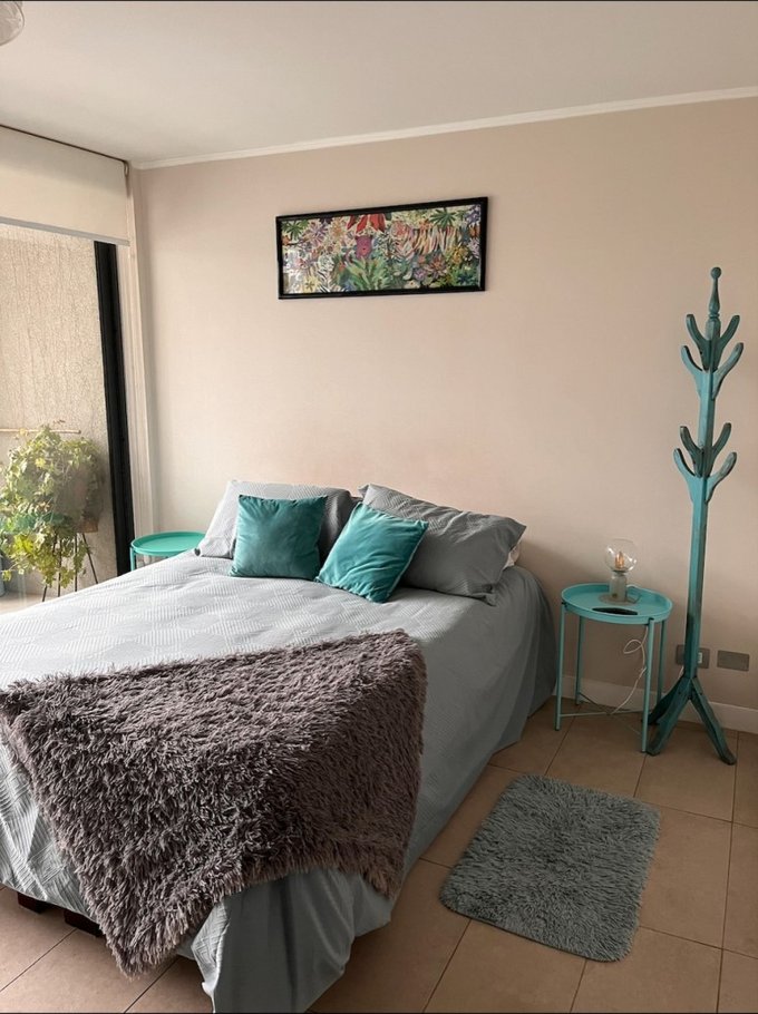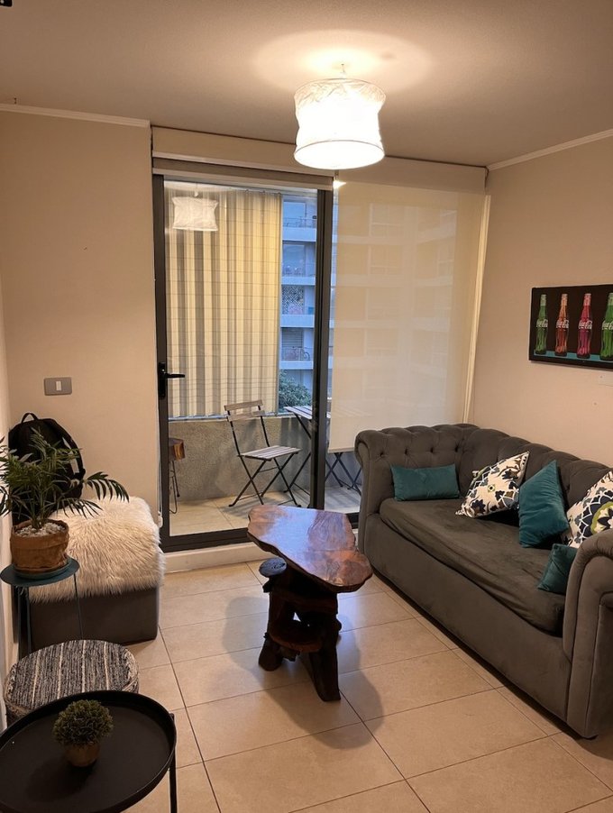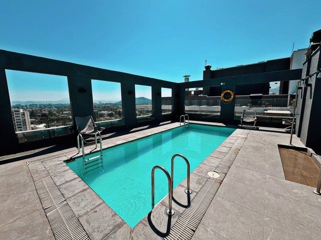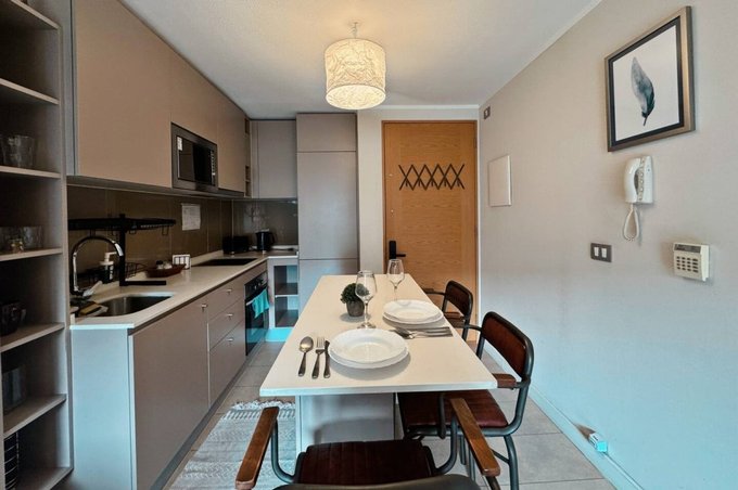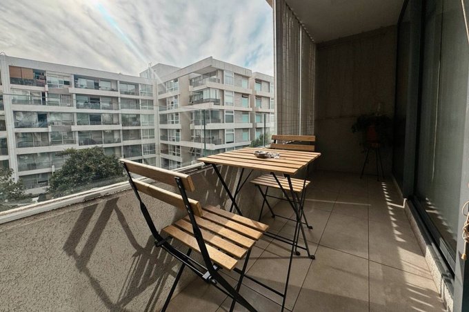 Impecable y moderno departamento, tercer piso, 45 mts, orientacion poniente, 1 dormitorio en suite, walking closet, baño con shower door, living, cocina incorporada, isla, cubierta de cuarzo, equipada con encimera vitroceramica, horno electrico, campana, microondas, refrigerador, conexión para lavadora, living y domitorio con salida a terraza, cortina hangaroa de madera blanca y cerradura inteligente. Ventanas termo panel, cortinas roller, piso porcelanato. Estacionamiento. Equipamiento del edificio: piscina, quinchos, sala gourmet, gimnasio, lavandería, sala de juegos, quincho, lavandería, jardin interior, bicicletero, estacionamiento de visitas, conserjeria 24 horas, camaras de seguridad. Excelente conectividad con estacion metro plaza egaña. Mall plaza egaña, comercio, cafeterias, restaurantes, centro medico, bancos.