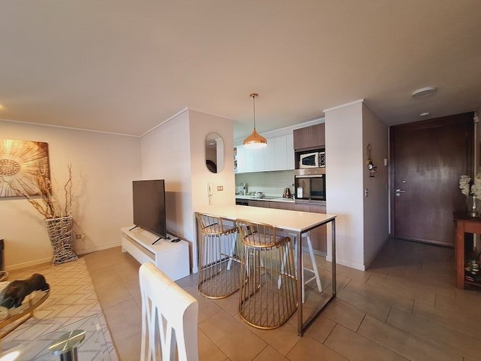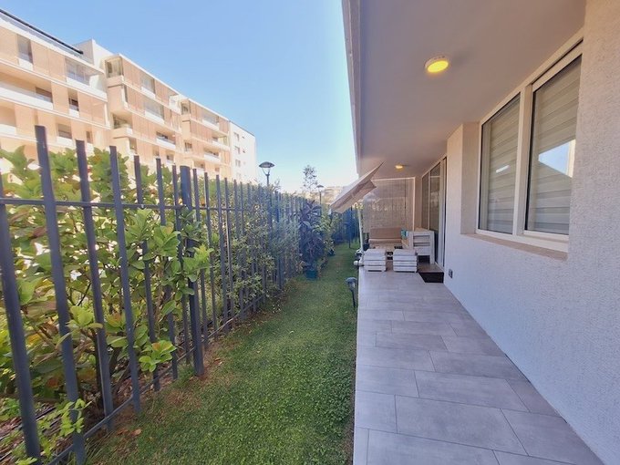 Se arrienda departamento con patio privado de 2 dormitorios 2 baños más sala de estar, en sector residencial de Peñalolén. Emplazado en primer piso, cuenta con cocina equipada con encimera vitroceramica, horno y campana eléctrica, destaca su jardín de uso y goce exclusivo.