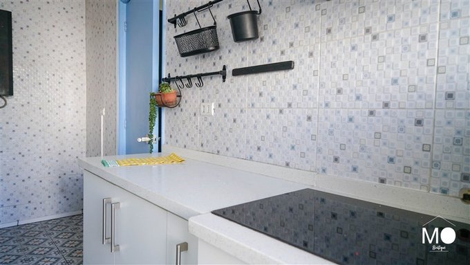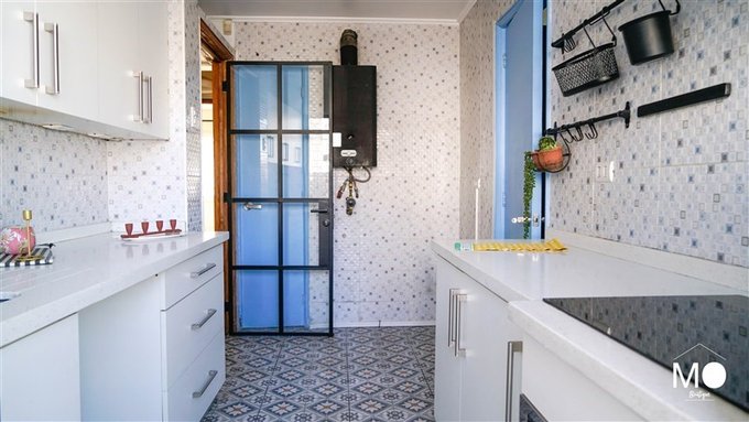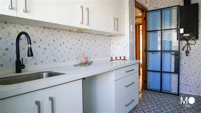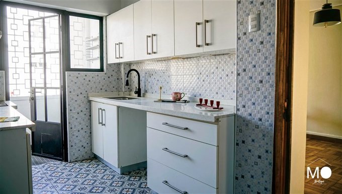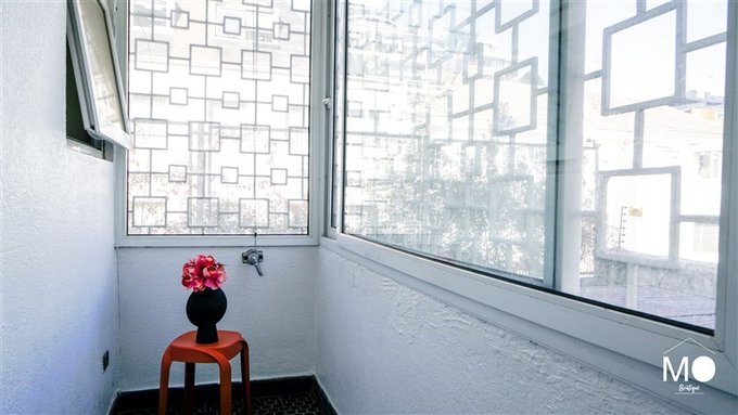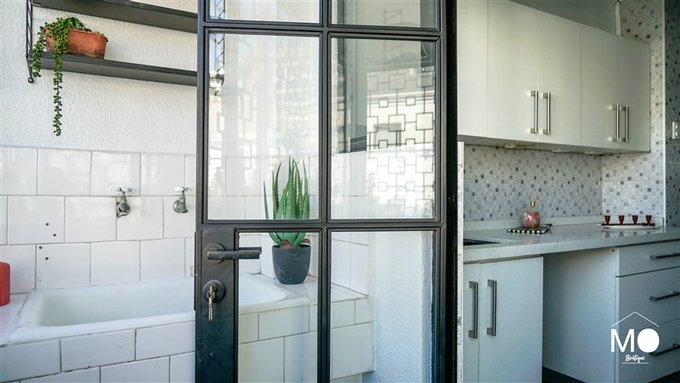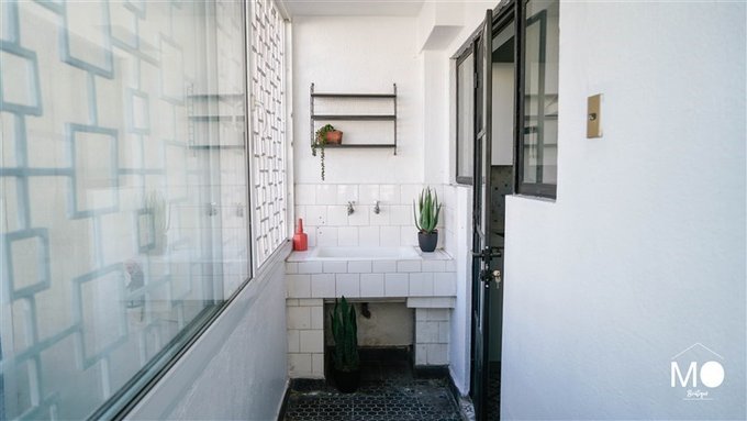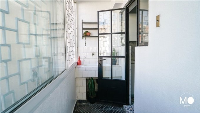 Balcon en la cocina donde también está ubicada la logia con iluminación natural, lavadero y colgador mural