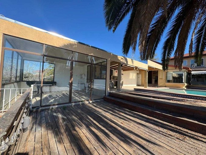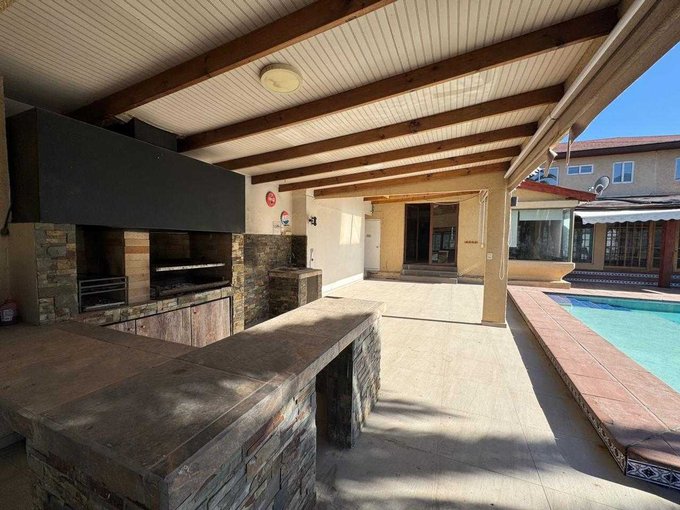 Patio trasero con gran piscina, quincho, sala de juegos, terraza techada y una para tomar sol con una hermosa vista.