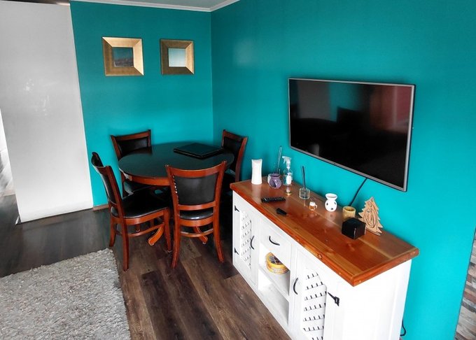 Living-Comedor: Equipado con juego de comedor, Smart TV, rack, sillón en L y estufa a combustión lenta.