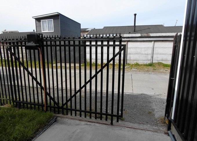 Exterior: Patio con áreas verdes y portón de acceso controlado.