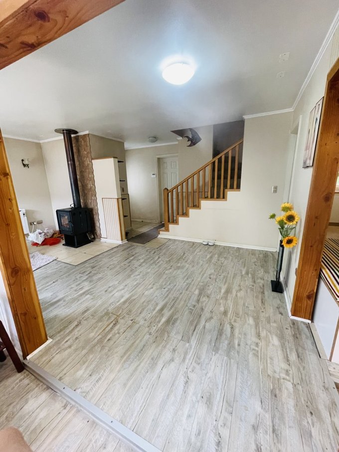La propiedad cuenta con 3 dormitorios (1 en suite con walk-in closet), 2 dormitorios amplios con clóset empotrado, amplia sala de estar y living comedor espacioso con bar incorporado. Dispone de 4 baños: 2 completos y 2 de visita/servicio. Cocina amoblada y equipada, lavandería, patio con cerámica y leñera.