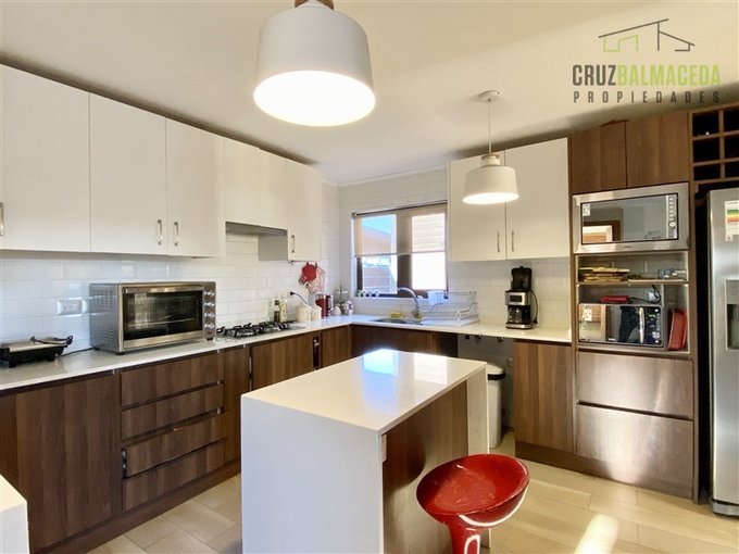 - Cocina cerrada con mesón isla, cubierta de granito, encimera y horno eléctrico, comedor de diario y amplio espacio.