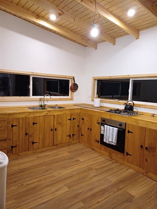 Cocina equipada con muebles rústicos, encimera, horno y refrigerador