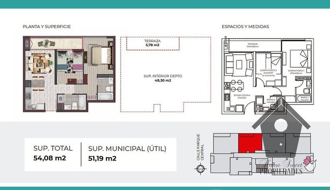 Piso de porcelanato en living comedor, cocina, pasillo y baños. Piso flotante en dormitorios. Ventanas con marcos de PVC blanco y vidrios termopanel. cubierta de granito en zonas húmedas de la cocina. Closet en ambos dormitorios. Cocina amoblada y equipada con encimera a gas de cuatro platos, horno eléctrico empotrado y campana extractora, agua caliente con cálefon en el costado de la terraza. Baño común con espacio para lavadora atrás de la puerta- Luminarias y cortinas roller instaladas.