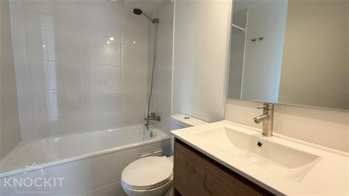 Baños modernos y funcionales que están equipados con tina, grifería de calidad, espejo amplio y un elegante mueble vanitorio de madera, perfecto para organizar tus esenciales diarios.