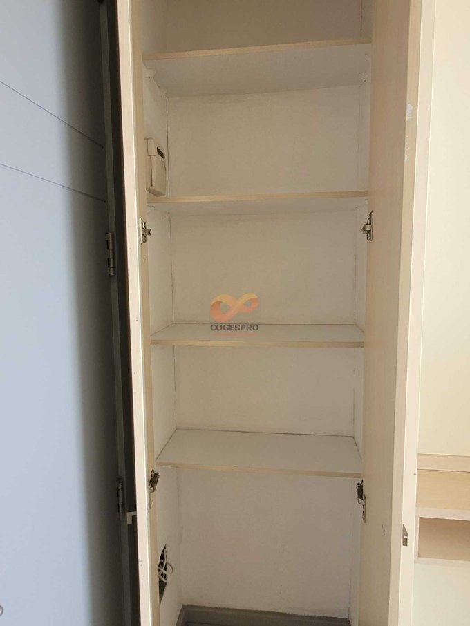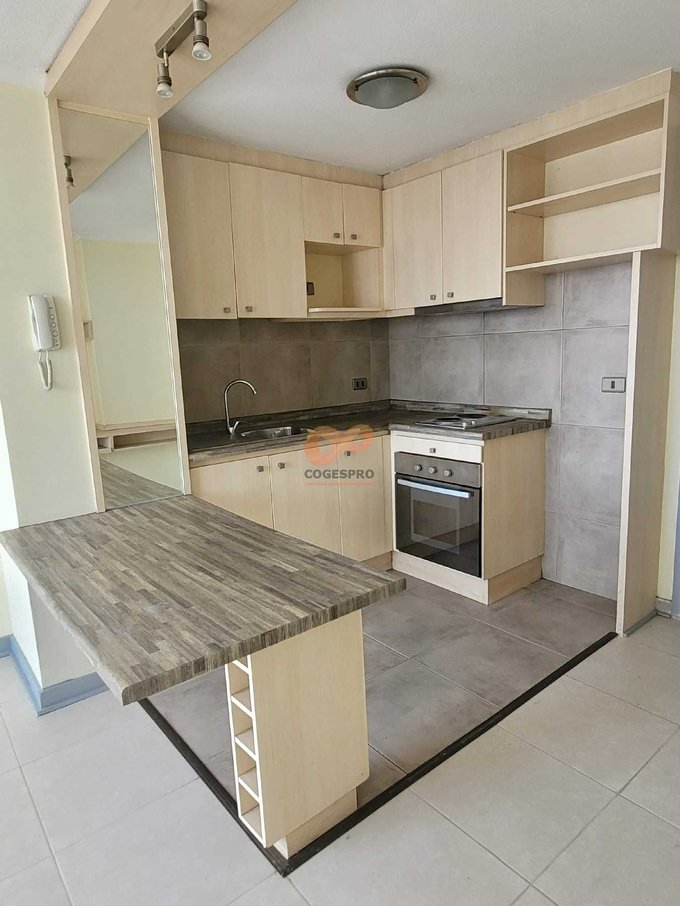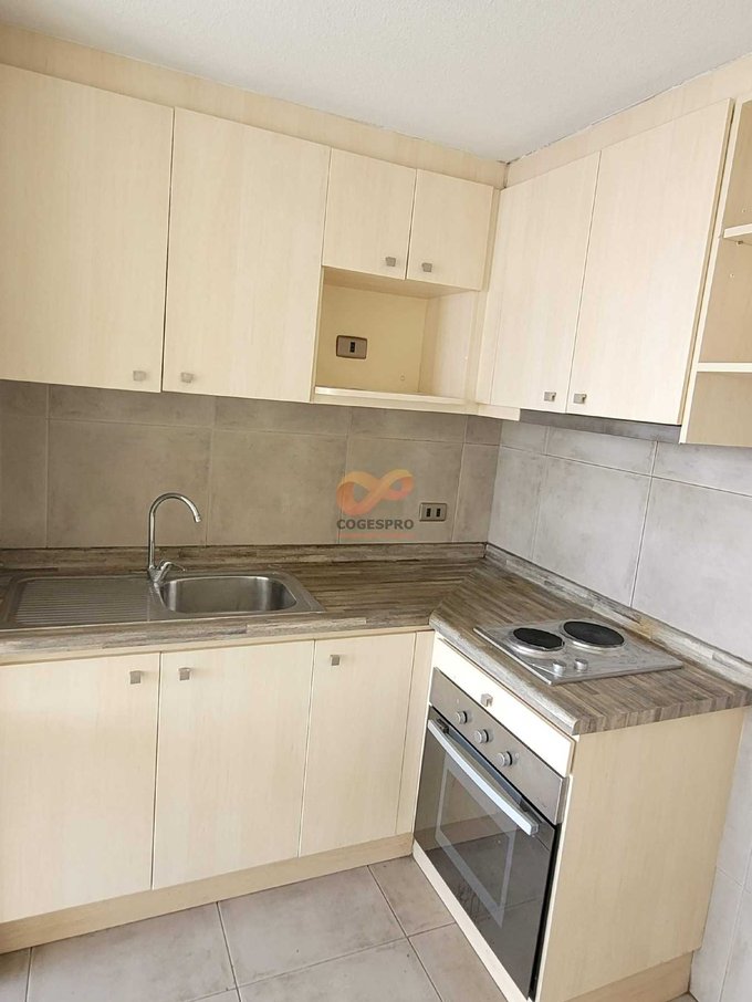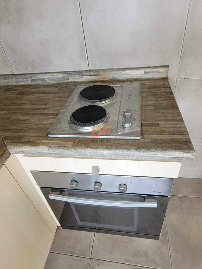 - Cocina americana con muebles base y aéreos empotrados (encimera de dos platos, campana y horno eléctrico)