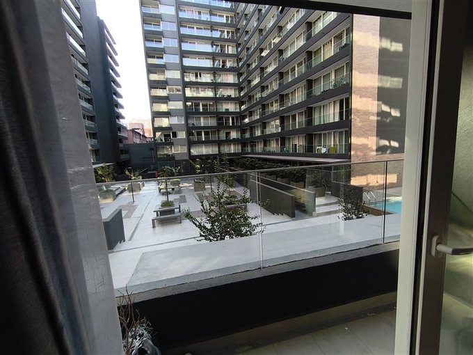 Terraza con vista a la plaza interior del condominio.
