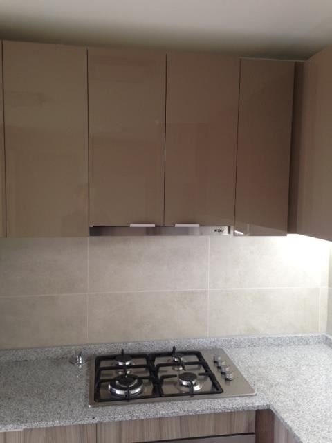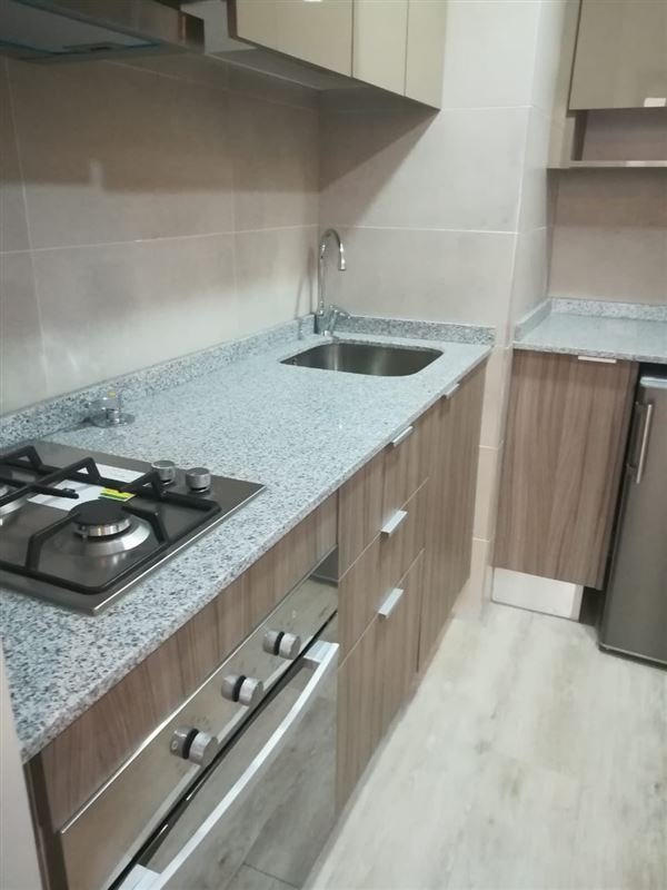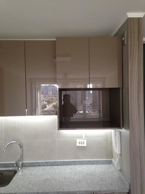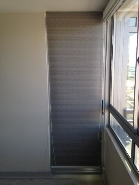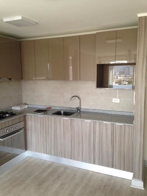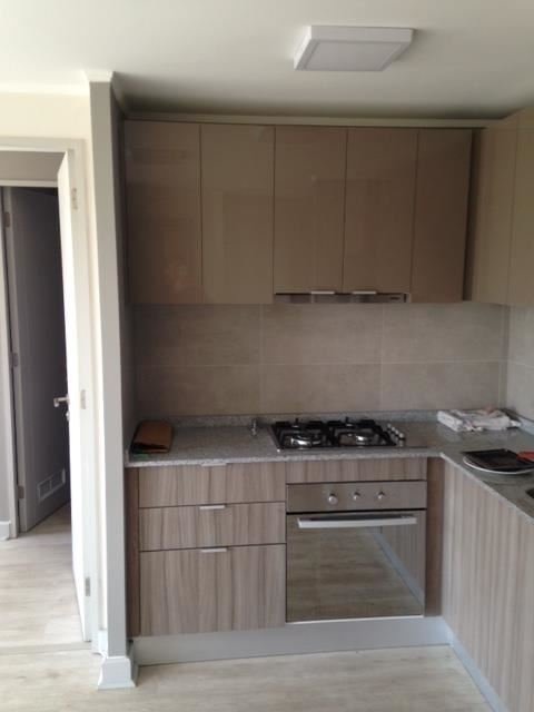 Living comedor con cocina americana de 4 platos, horno y campana eléctrica, Piso Flotante, con instalación para Lavadora, con amplia Terraza Cerrada con mampara de termo panel , lamparas y cortinas blackout