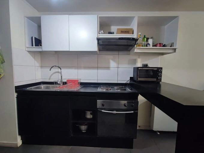- Cocina americana amoblada con campana, cocina y horno.