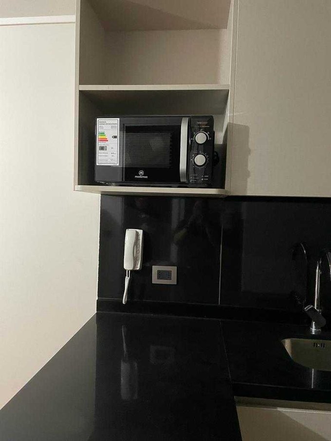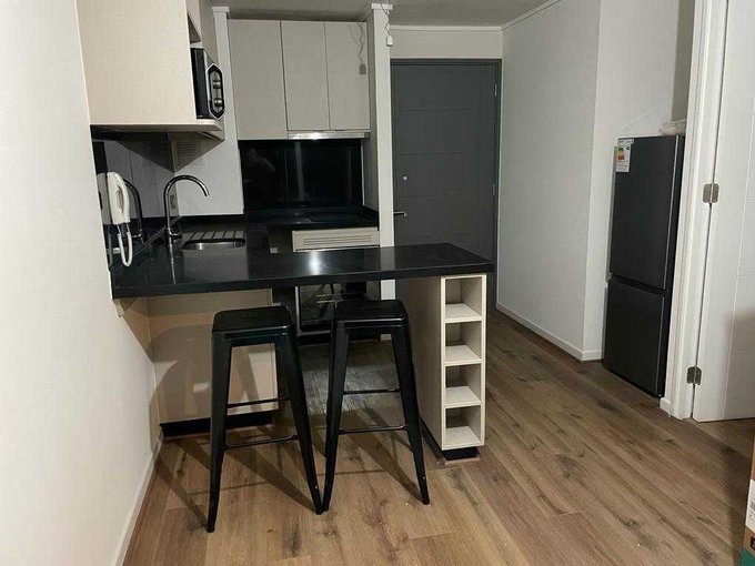 Departamento semi amoblado con horno, cocina, microondas, refrigerador, sillas y futón.