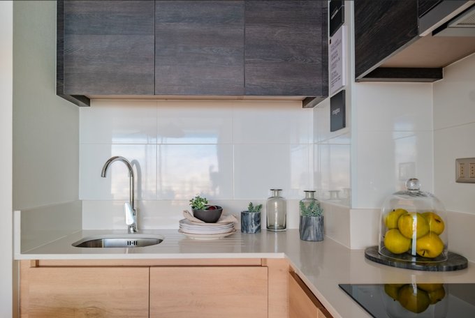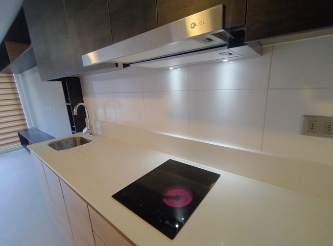 - Cocina integrada equipada con: cocina + horno eléctrico y campana.
