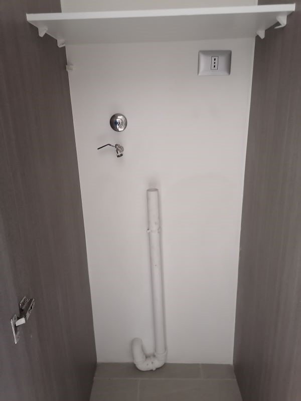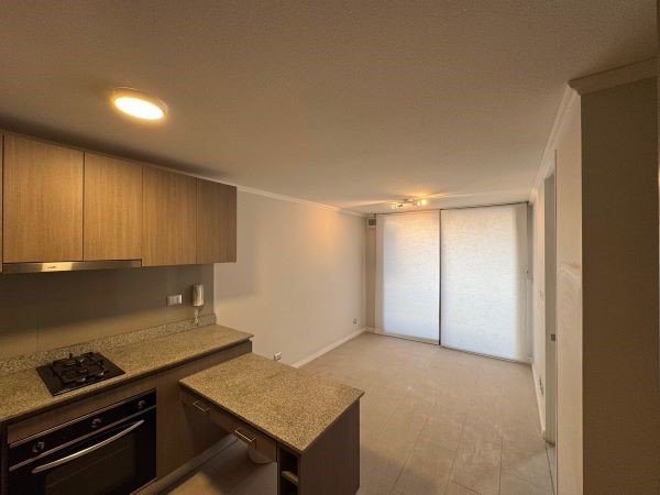 Living con balcón, cocina americana, con encimera de 2 platos a gas, horno empotrado eléctrico, almacenamiento, mesada, closet tipo despensa, instalación de lavadora, espacio para refrigerador.