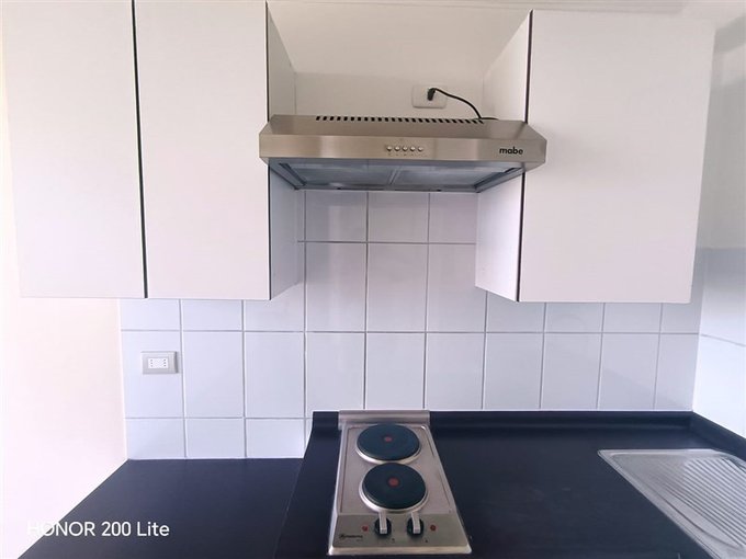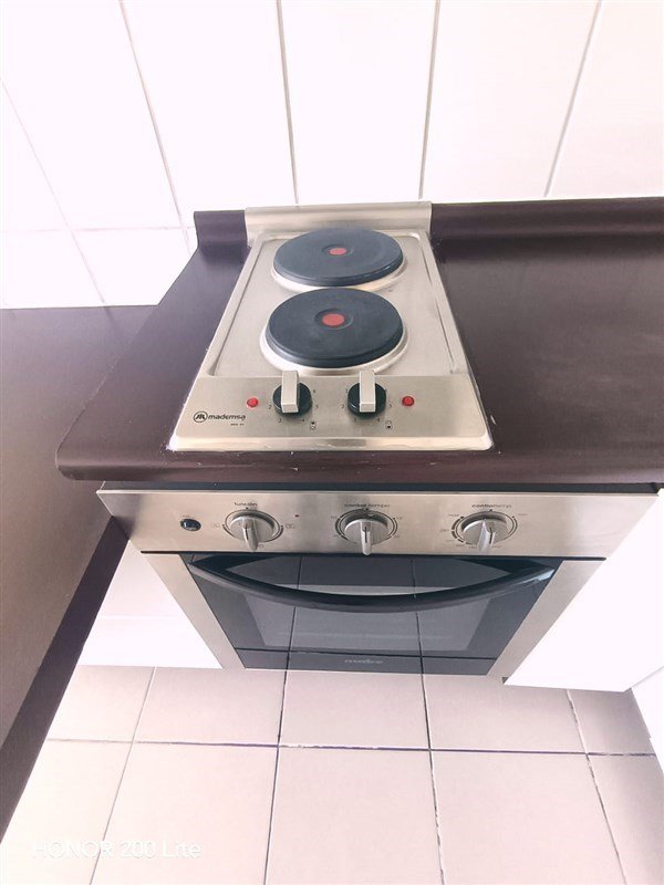 Cocina equipada con encimera de dos platos, horno y campana eléctrica.
