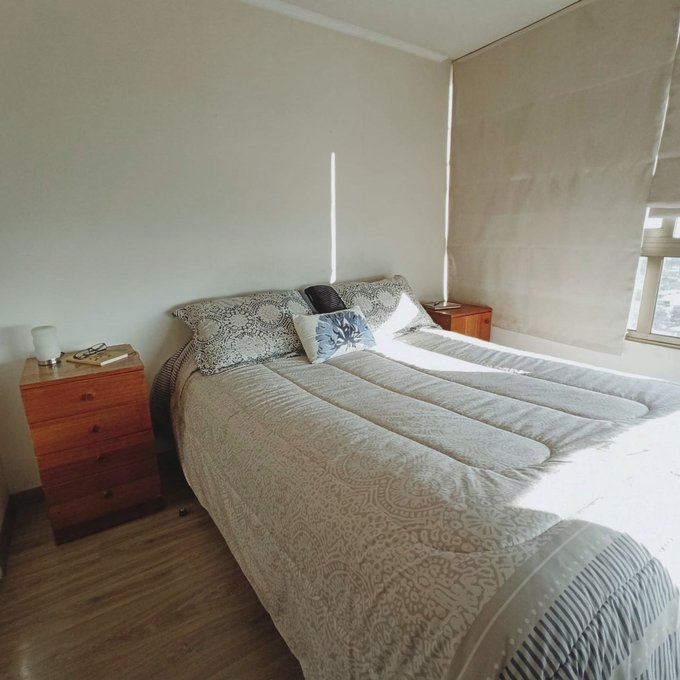 Se ofrece en arriendo un encantador departamento de dos dormitorios y un baño, sin amoblar, con una superficie total de 50 metros cuadrados. Incluye un estacionamiento propio en el (-1).La cocina está equipada con una moderna encimera eléctrica de vitrocerámica de cuatro quemadores, un amplio espacio de almacenamiento y un acogedor desayunador de madera con cuatro sillas. Además, cuenta con una elegante encimera de granito y una vinera de madera situada en la parte superior del refrigerador. Los acabados de alta calidad se aprecian en todos los rincones del departamento.