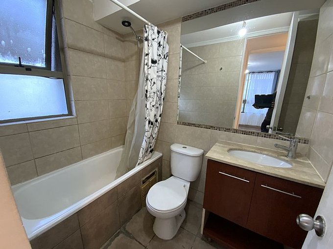 BAÑOS: 1 baño amplio con piso y murallas de cerámica. Lavamanos en mueble de dos puertas superficie de granito, espejo mural amplio, tina de baño y ventana con ventilación natural. Cuenta con espacio y grifería para lavadora.