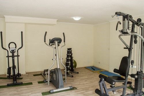 Edificio con sala de eventos, estacionamiento de visitas, gimnasio, piscina y lavandería.