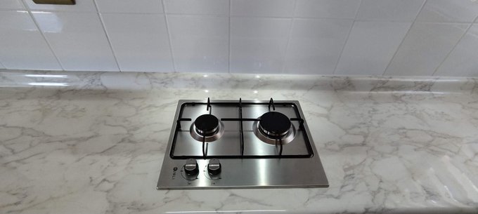 Cocina con muebles, encimera a gas y extractor.