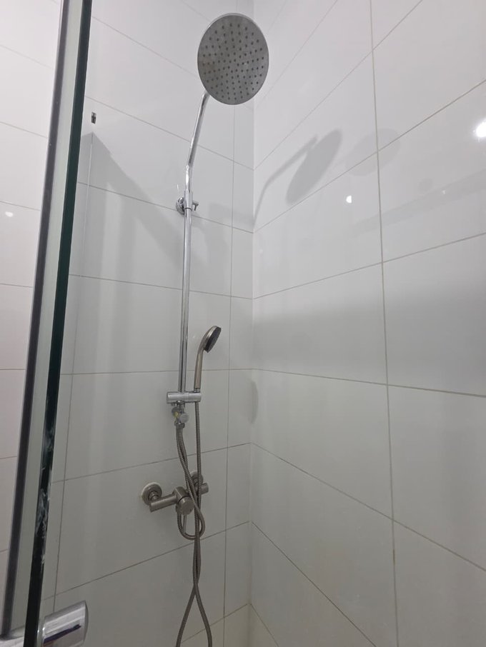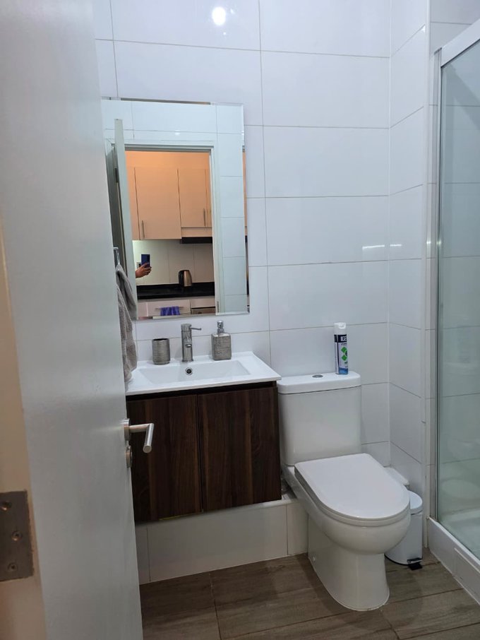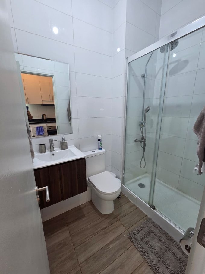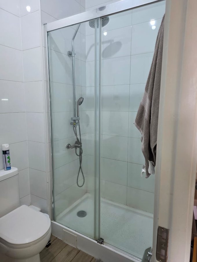 Baño moderno con shower door y vanitorio.