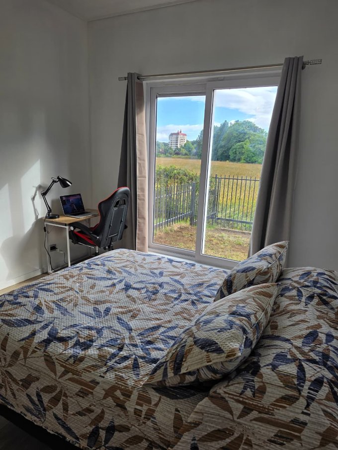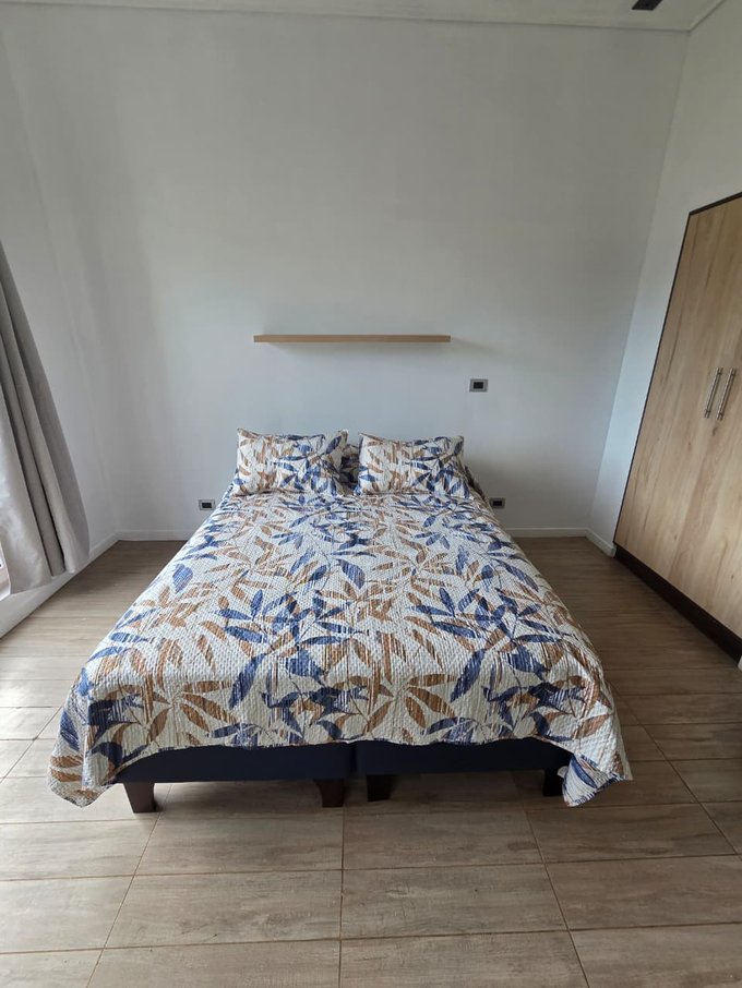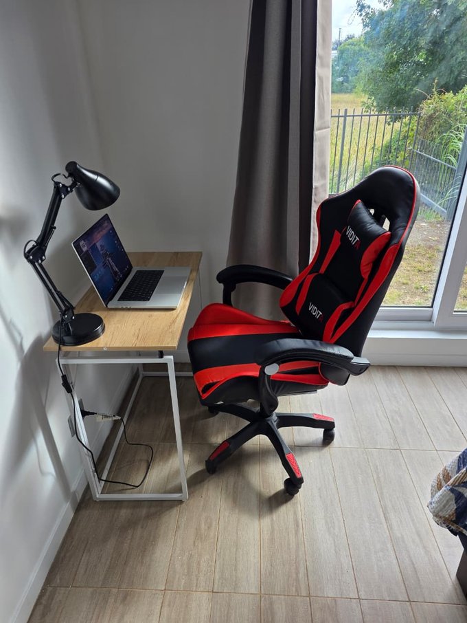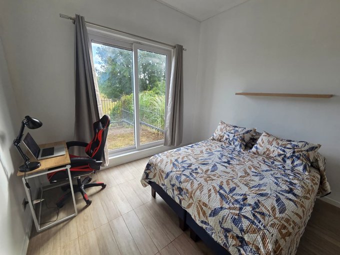 Ambiente único con cama de 2 plazas, escritorio y silla de trabajo.