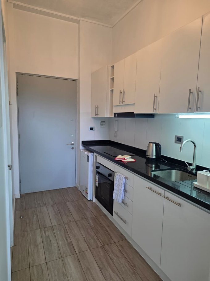 Encimera, horno eléctrico, frigobar y campana.