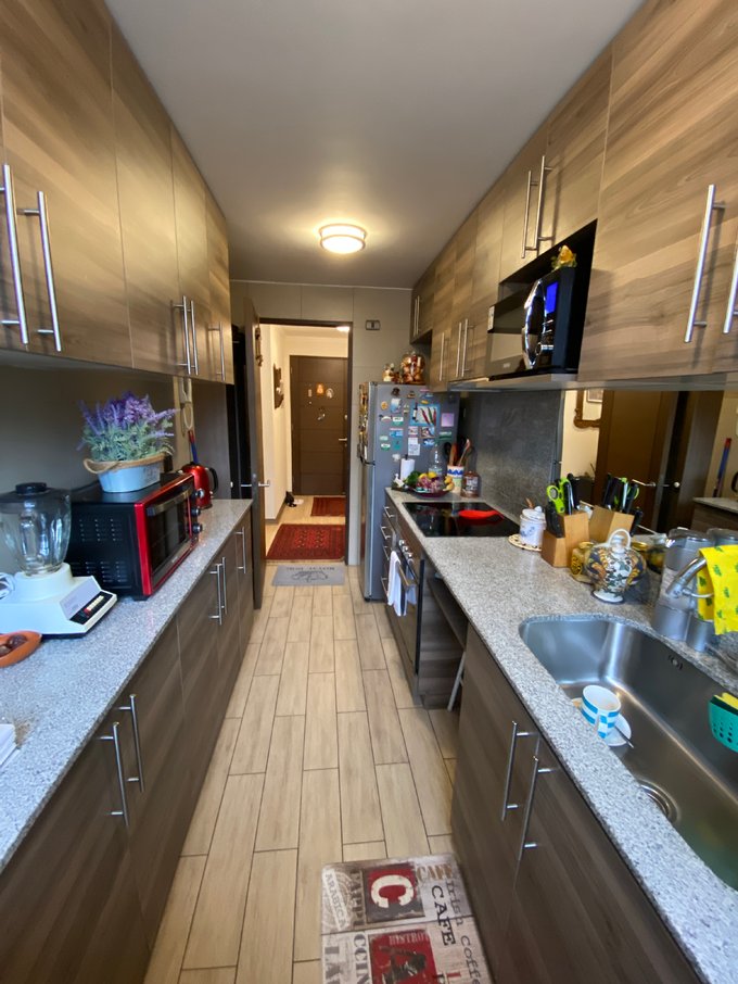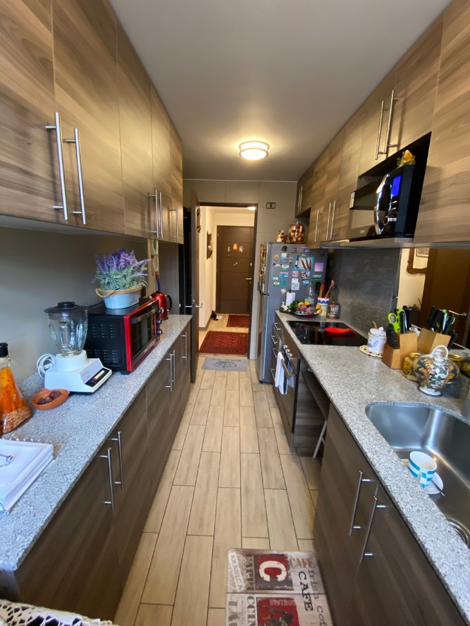 LivIng comedor amplio con salida a terraza , Cocina amoblada completamente con cocina encimera de 4 platos , horno eléctrico, mesón de granito .