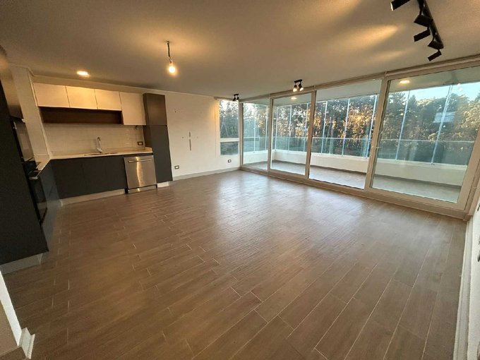 Terraza con cierre de cristales plegables, termopanel y cortinas roller en todo el departamento.